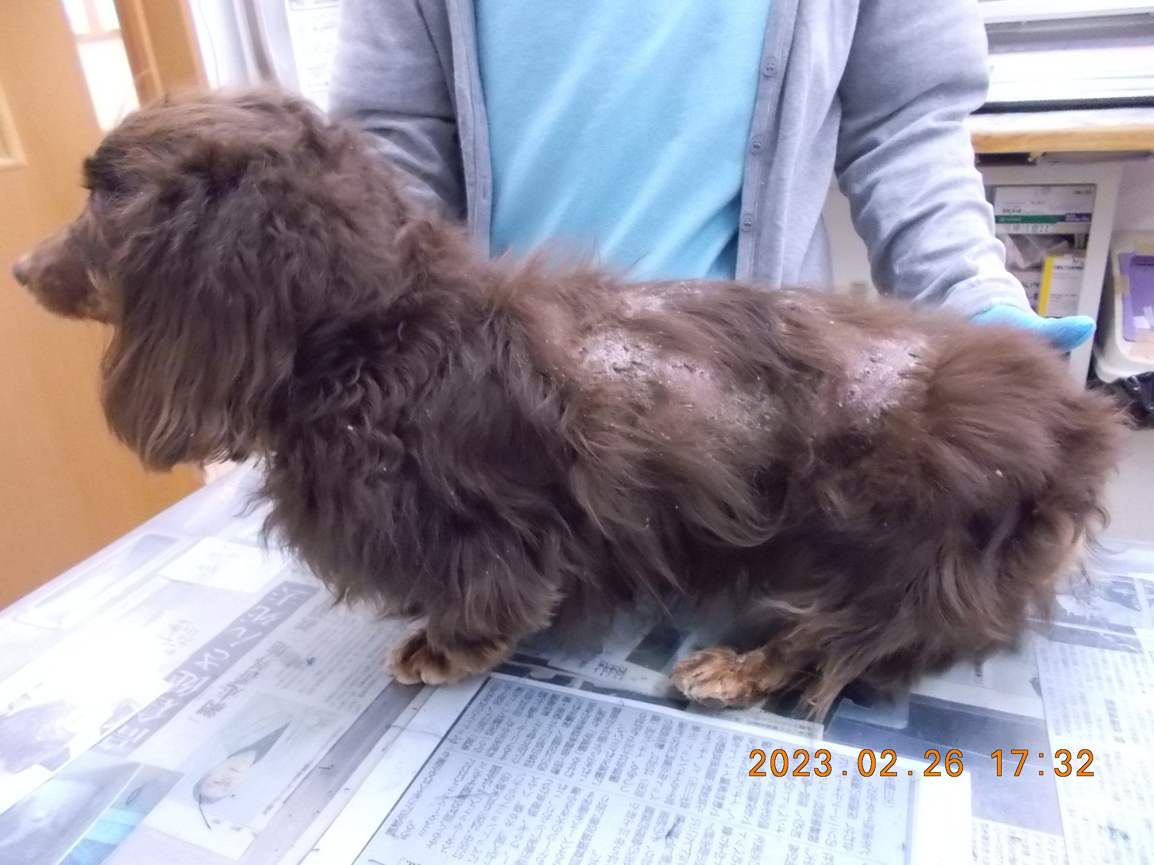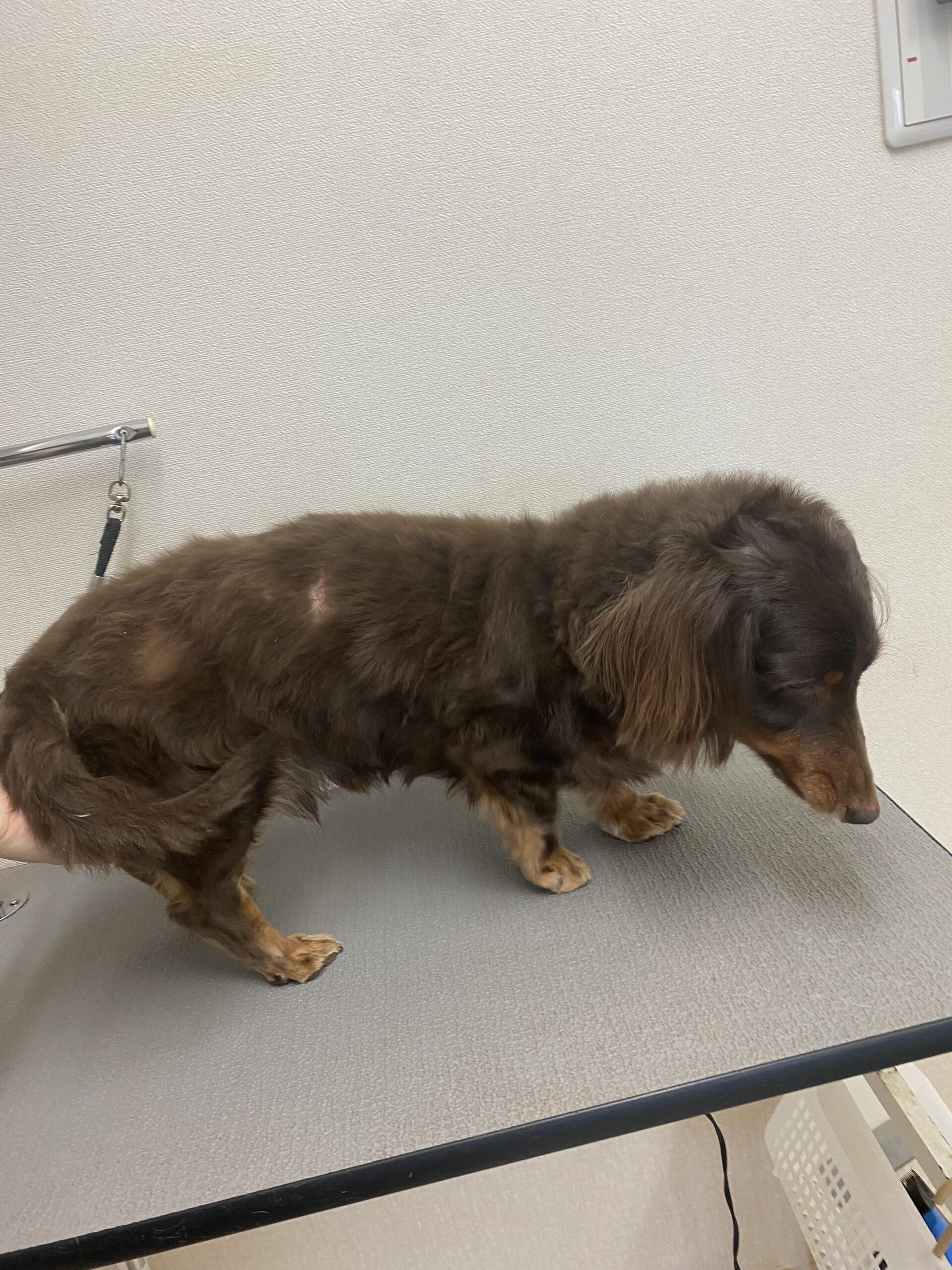 医療トリミング 医療トリミング ミニチュアダックスフンド 医療トリミング ミニチュアダックスフンド 内分泌ホルモンの異常のあるワンちゃんで、ドックフードのみでの飼育と内分泌ホルモンの投薬でコントロールしながらシャンプー療法で3~4週間おきに通院していただきました。 治療途中 治療後